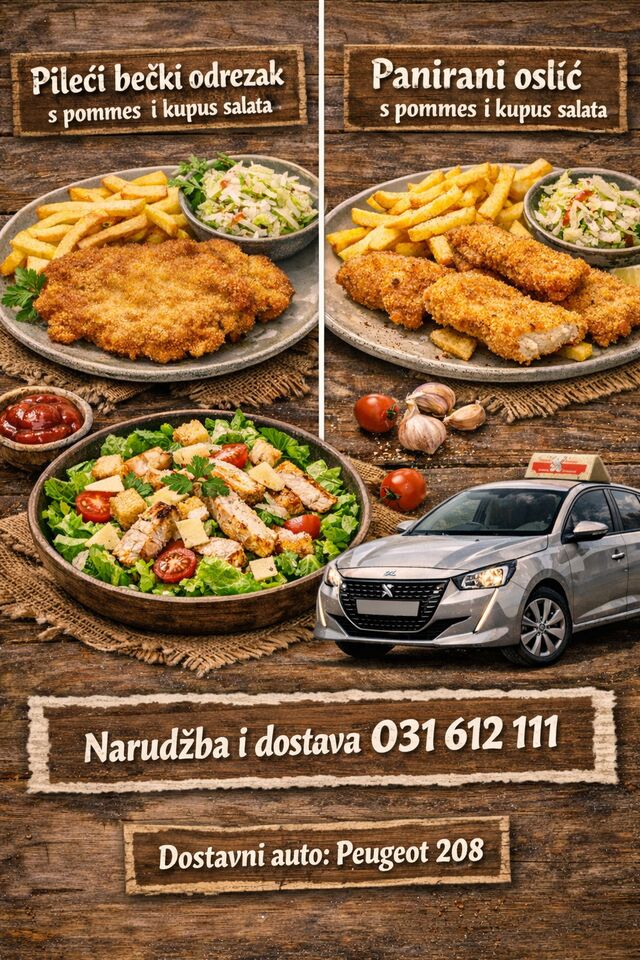 Preko 40 vrsta pizza , ćevapi u domaćem somunu ili s pommes, gurmanske pljeskavice s domaćim krušćićima, zapečeni grah, zagrebački odrezak, bečki odrezak, bon appetit odrezak, spaghetti bolognese, tortilje, njoki s pršutom, lignje, salate i još punoooo fine papice.